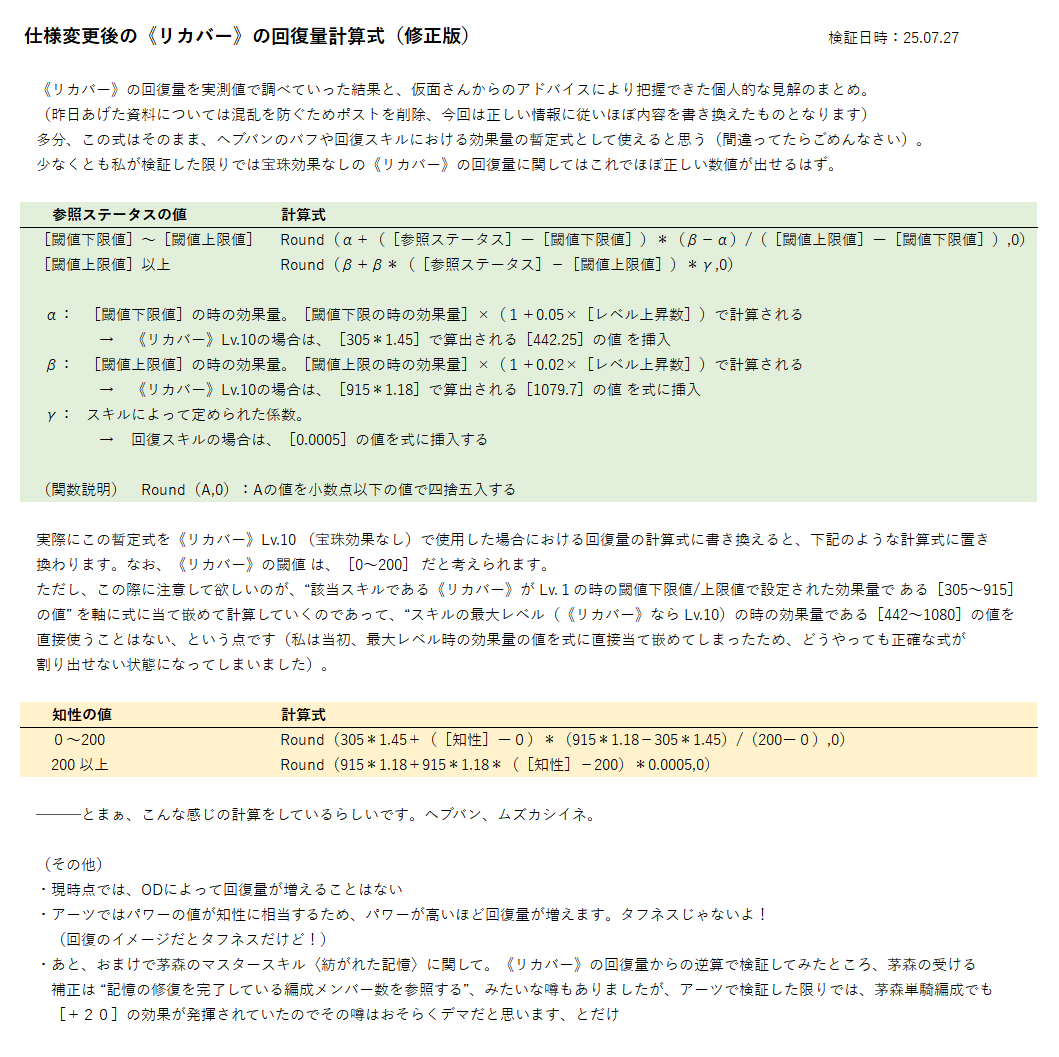 ダメージ計算仕様変更後の《リカバー》回復量計算式
